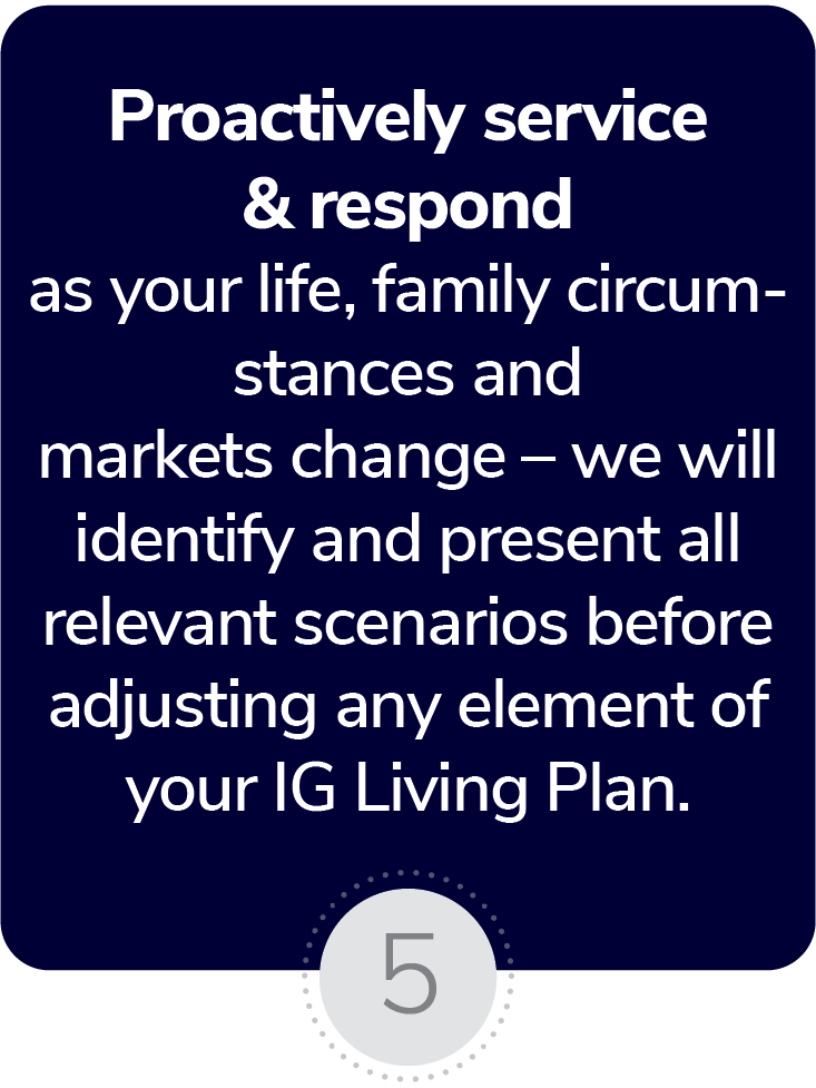 We’ll clarify your goals and concerns, evaluate your current financial situation, and synchronize six major areas of your financial well-being to create your IG Living PlanTM.